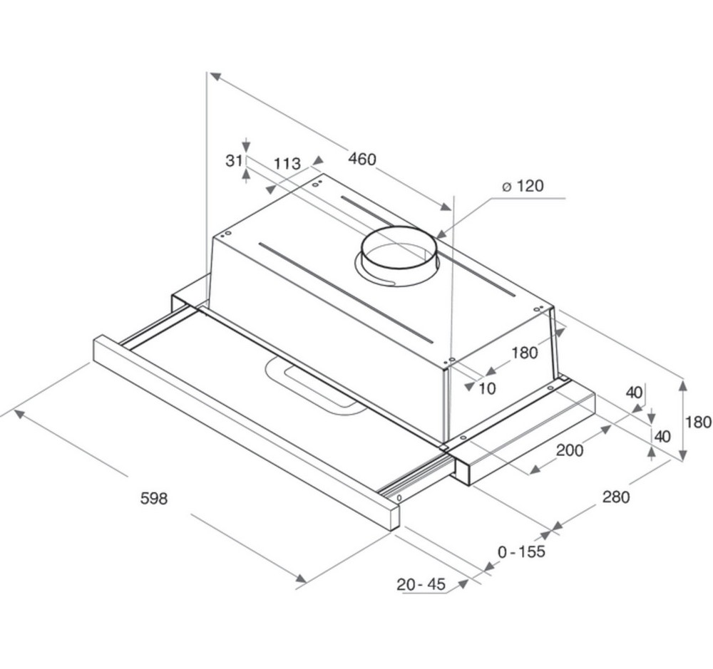 Skrytý "inkognito" odsavač do kompaktní kuchyně. Instaluje se do horní skříňky kuchyňské linky, po zasunutí výsuvné části je viditelná pouze přední nerezová dekorativní lišta.
