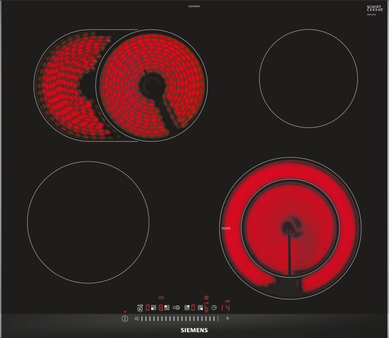 Výkon a počet varných zón 4 varné zóny highSpeed , z toho: 1 dvouokruhová zóna 1 1 varná zóna s rozšířením na pečicí zónu senzorové tlačítko 17 stupňů výkonu
