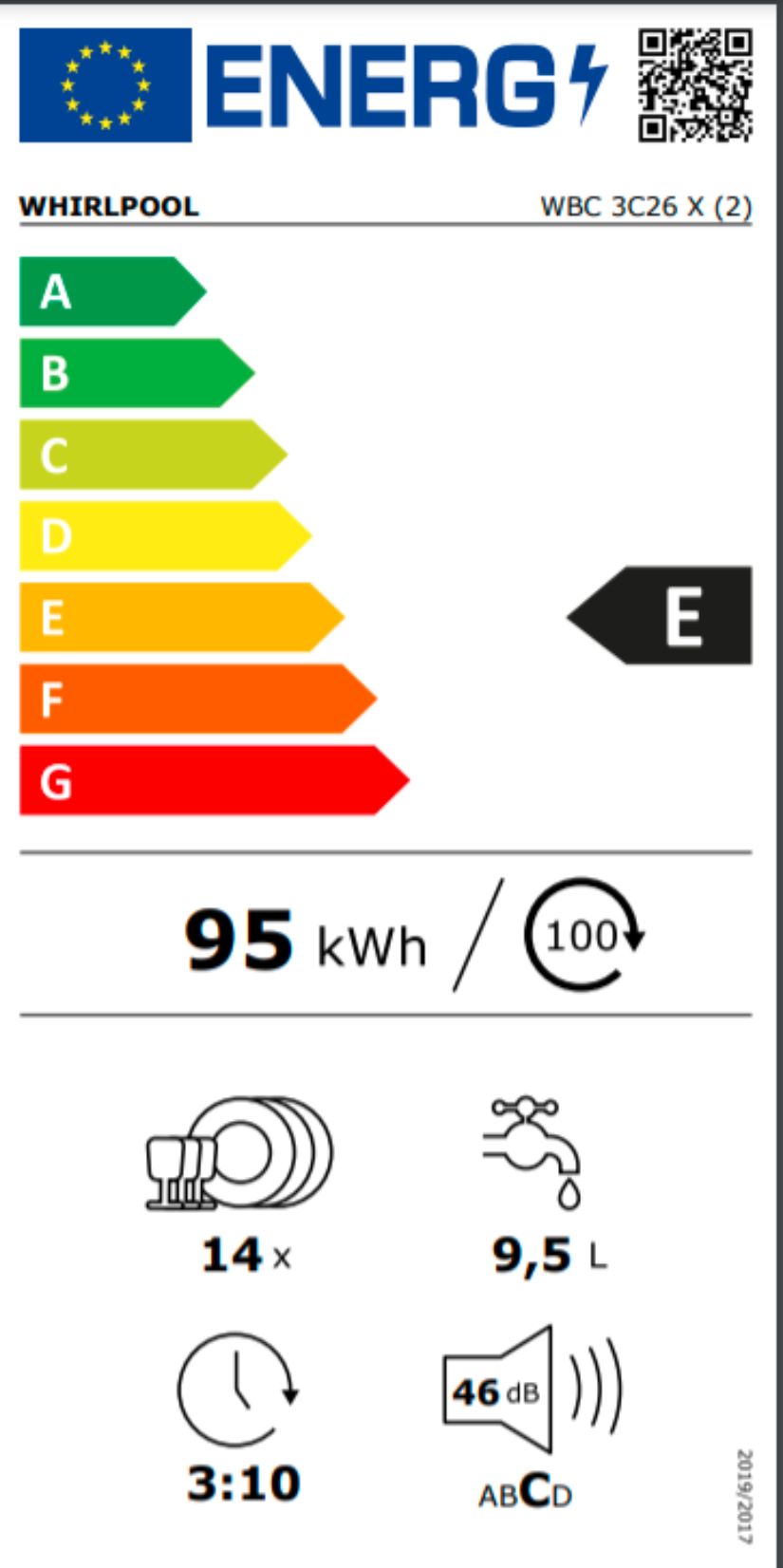 Myčka nádobí s panelem Whirlpool WBC 3C26 X v energetické třídě E ve standardní šířce 60 cm.
