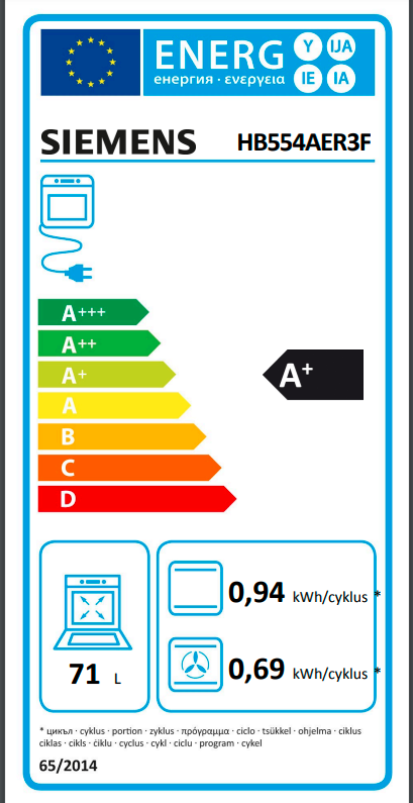 spotřeba energie na cyklus při konvenčním ohřevu:0.9 kWh(na stupnici třidy energetické účinnosti od A+++ do D)