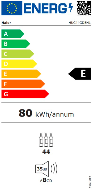 Vestavná vinotéka Haier HUC44GDEH1 Hlavní vlastnosti Třída energetické účinnosti: E Celkový čistý objem (l): 105 Kapacita lahví: 44 Spotřeba energie za den (kWh/24 hod): 0,22 ...Více informací
